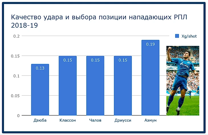 Любой современный нападающий ценен, конечно, и умением забивать голы. Хотя Артём в этом компоненте игры в сезоне и не сильно преуспел, забив всего 8 мячей, но зато он серьёзно помог своими действиями партнёрам по команде Азмуну (13) и Дриусси (11) быть одними из лидеров гонки бомбардиров. Стоит отметить, что Дзюба всё равно прекрасно находит ударную позицию, и по среднему качеству удара «Xg/shot» форвард "Зенита" также один из лидеров РПЛ среди нападающих. Безоговорочно лучшим игроком чемпионата России по этому показателю является Сердар Азмун, вторым - Дриусси, и в этом огромная заслуга Артёма, взявшего на себя большой объём черновой и подготовительной работы для своих одноклубников.