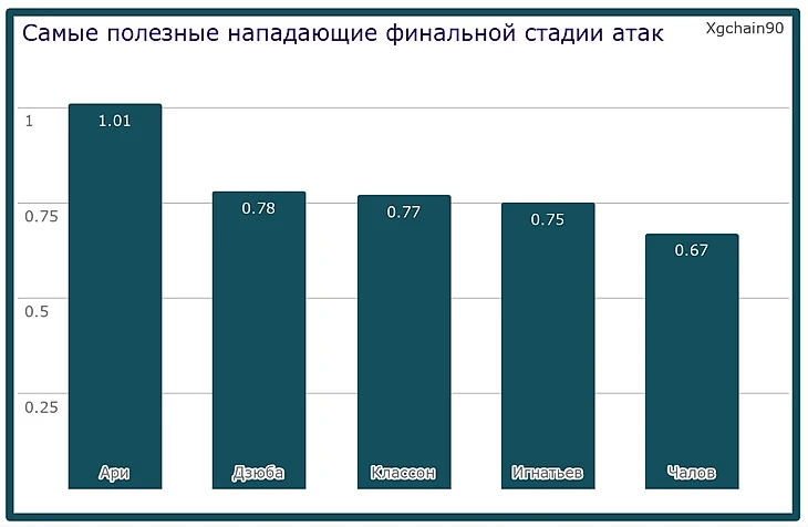 Снова обратимся к модели вероятных голов, на этот раз для оценки вовлечённости нападающих РПЛ в командный футбол. В совокупности все изложенные выше показатели, так или иначе, складываются в “Xgchain”, характеризующий участие игрока в полном цикле игровой комбинации от первой до последней передачи. Отличие “Xgchain” от описанного выше “Xgbuildup” в том, что при его расчёте во внимание берутся все без исключения передачи игрового взаимодействия, закончившегося ударом по воротам. По “Xgchain” в среднем за 90 минут среди нападающих РПЛ Дзюба уступает только Ари.