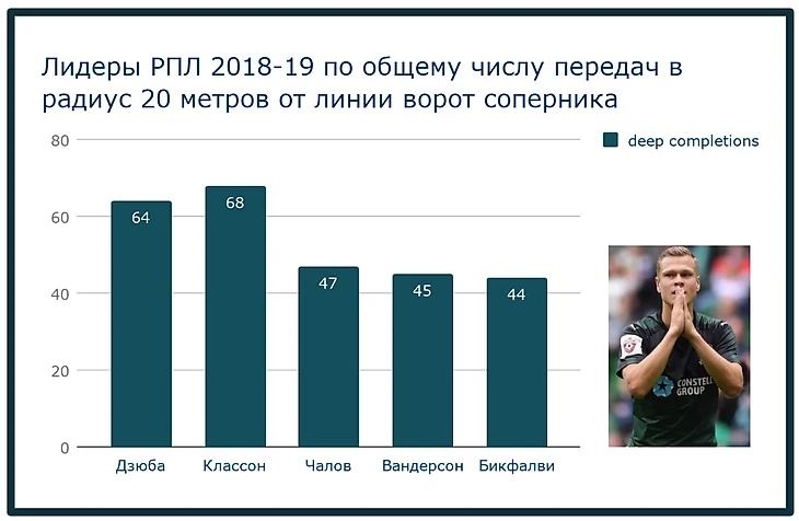 3). “Deep completions” – это точные передачи низом в радиус 20 метров от линии ворот соперника. Чем больше игрок выполняет таких пасов, тем в более опасной близости от ворот получают мячи его партнёры. На диграмме ниже видно, что по общему количеству передач в радиус 20 метров от ворот соперника среди нападающих в РПЛ Дзюба уступает только Виктору Классону.