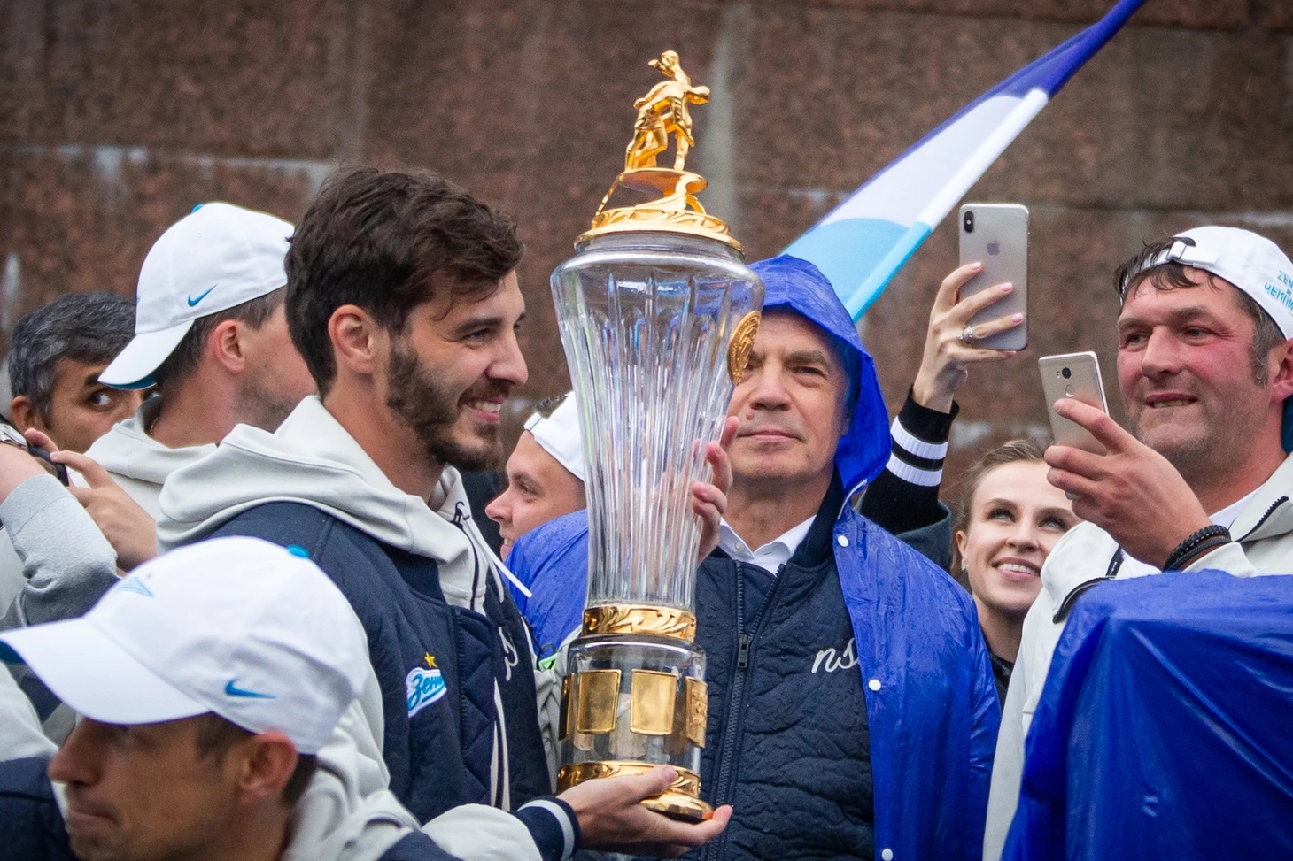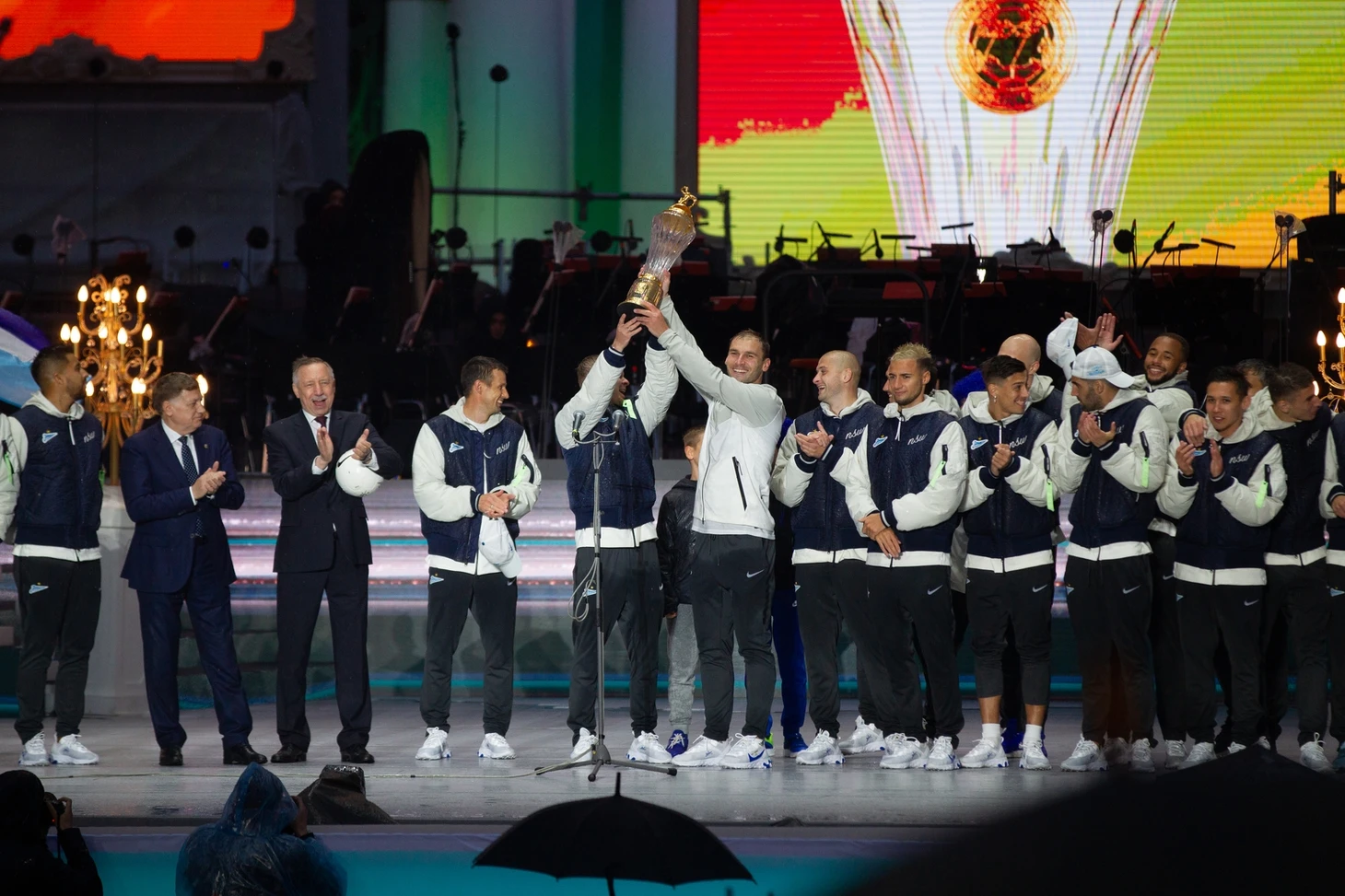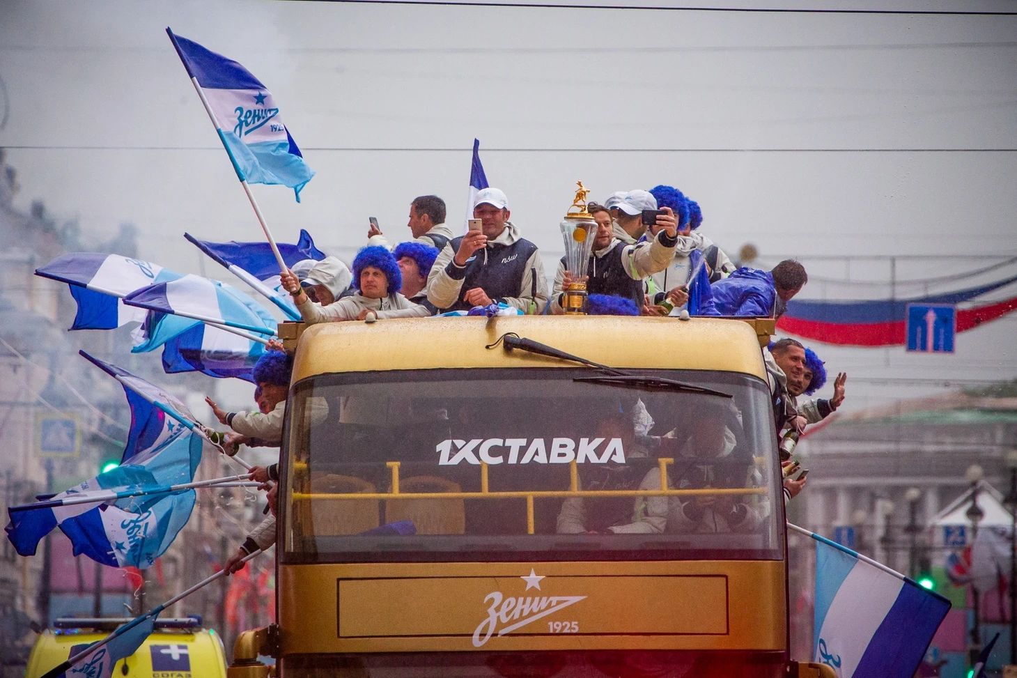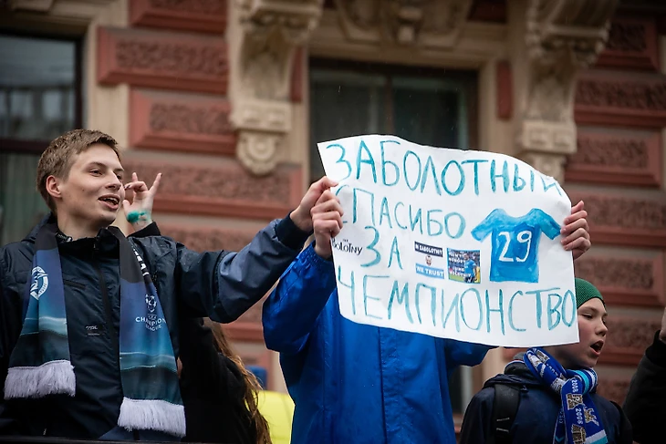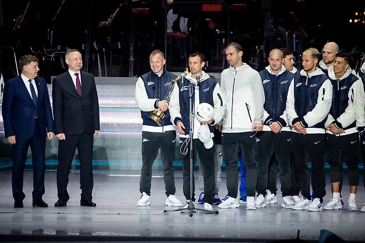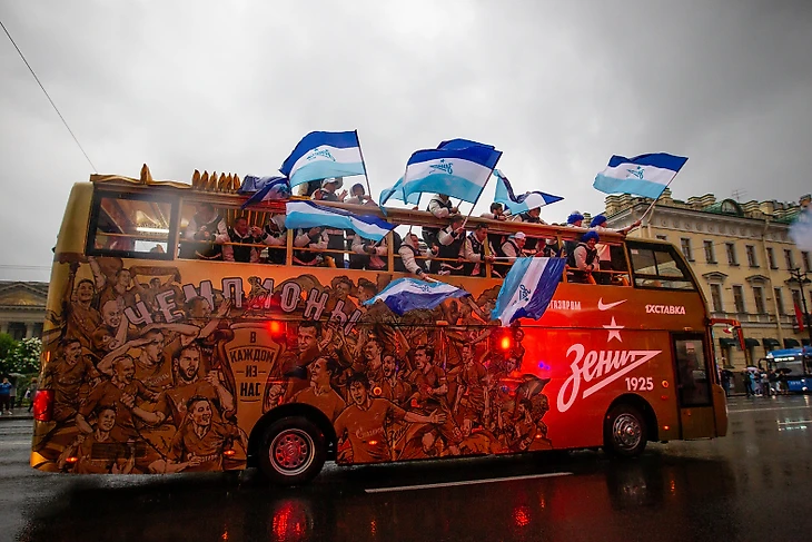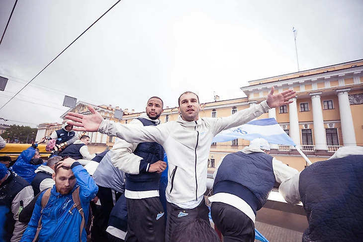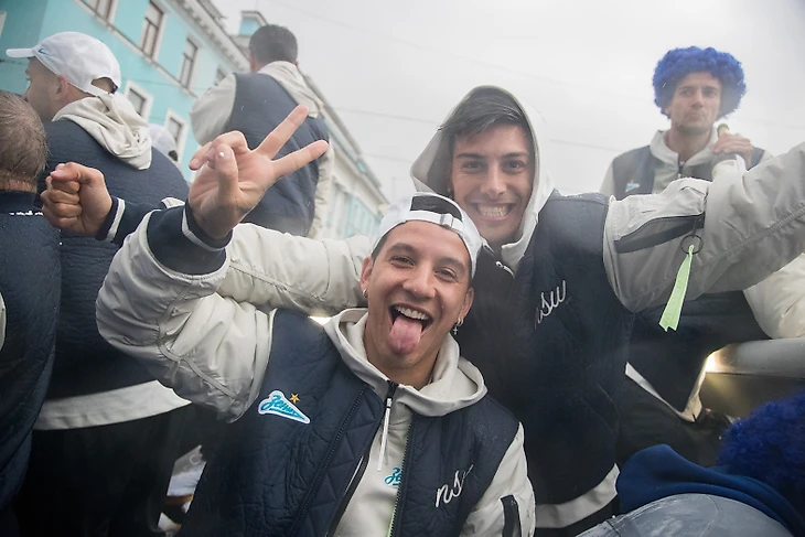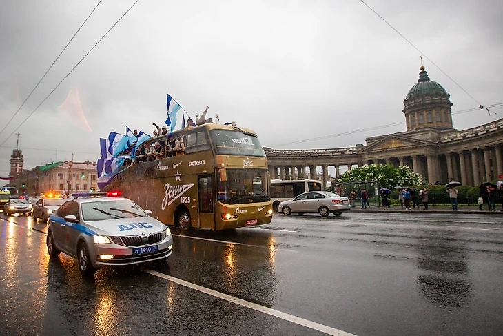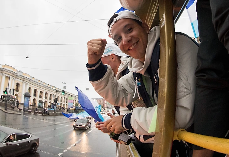 Торжественное шествие «Зенита» началось примерно через 3,5 часа после матча. Настроение у игроков и всего тренерского штаба было приподнятым. Праздник не испортила даже питерская погода.