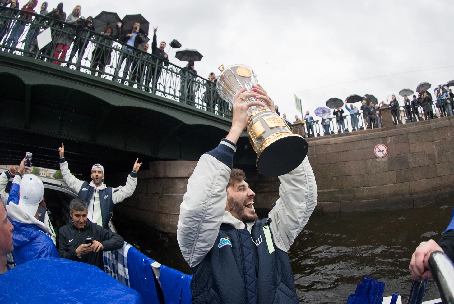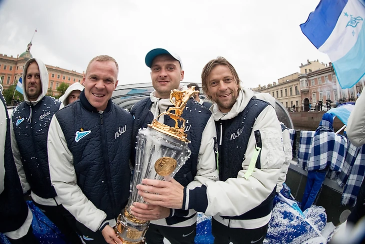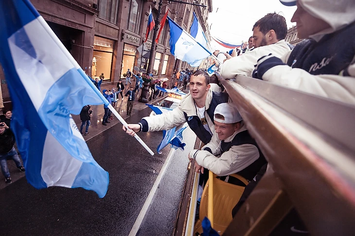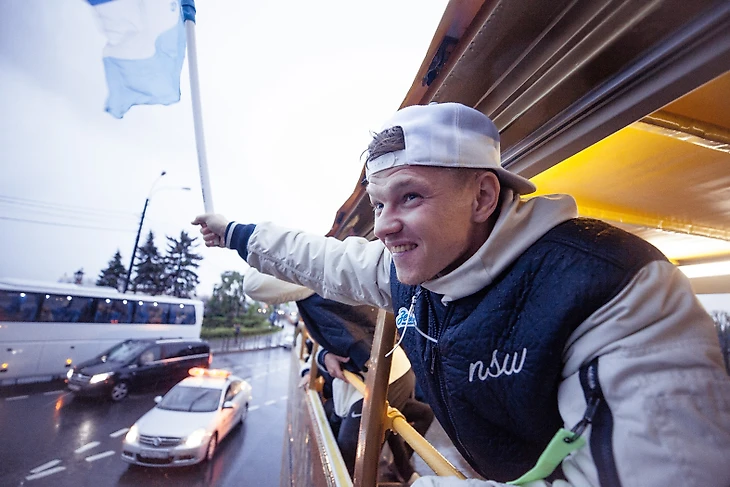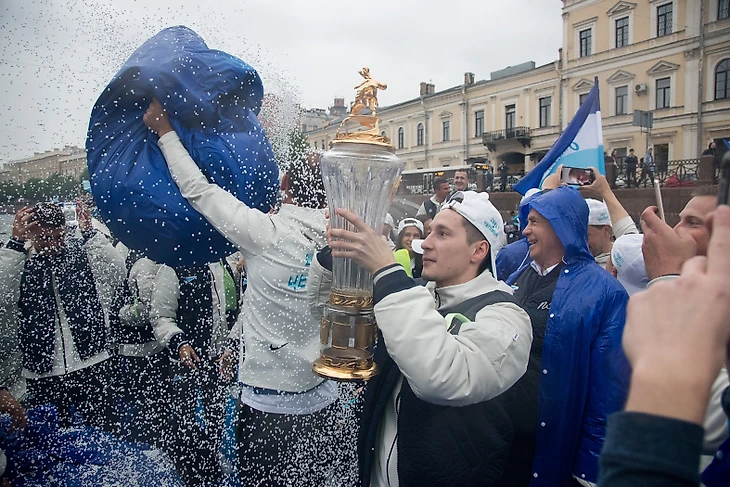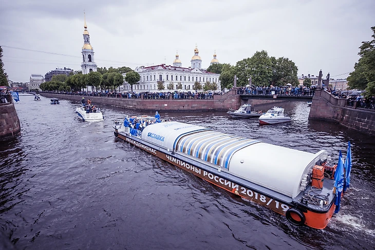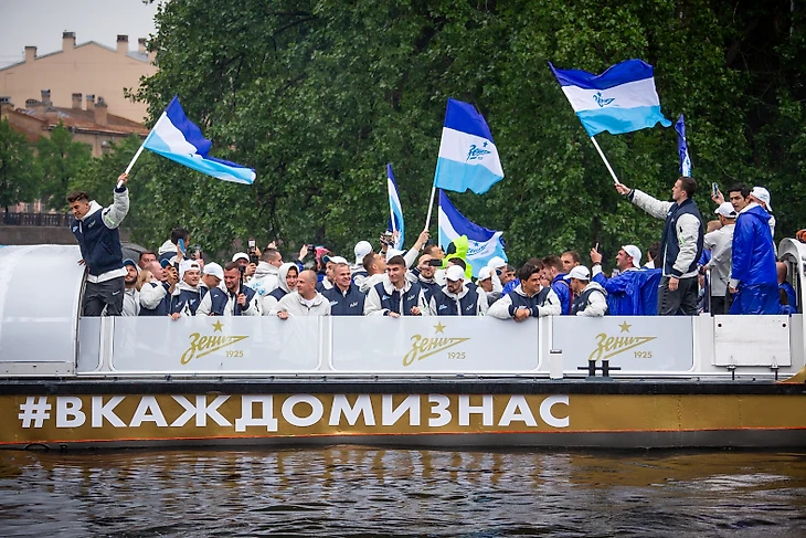 Команда села на корабль «Пальмира», чтобы в сопровождении фанатских судов пройти по рекам и каналам Петербурга. Сине-бело-голубая флотилия начала движение от пересечений Крюкова канала и канала Грибоедова. Тысячи петербургских болельщиков приветствовали футболистов с набережных, аплодировали и снимали футбольных героев на видео.