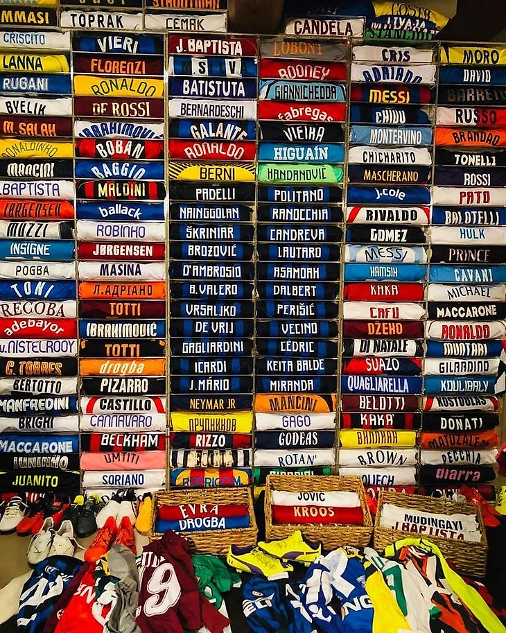Если присмотреться, то можно найти зенитовские майки Семака, Кришито, Халка, большую часть основы «Интера», миланского Роналдо и Габриэля Батистуты, две футболки Месси и почти в самом центре – футболка Александра Прудникова времен «Анжи».
