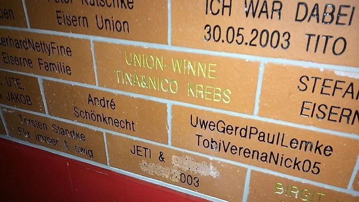 Милая маркетинговая кампания берлинского клуба предлагает купить кирпич в стене стадиона и выгравировать на нем свое имя. В период финансового кризиса эта акция приносила "Униону" по 80 евро за кирпич и 1500 евро за гранитную плиту.Сейчас стена "железных хранит сотни фамилий и хранит столько же историй. На фото представлена одна из них: разрыв отношений с подругой, заставил некого Йети вернутся к кирпичу с монтировкой и выцарапать имя бывшей.