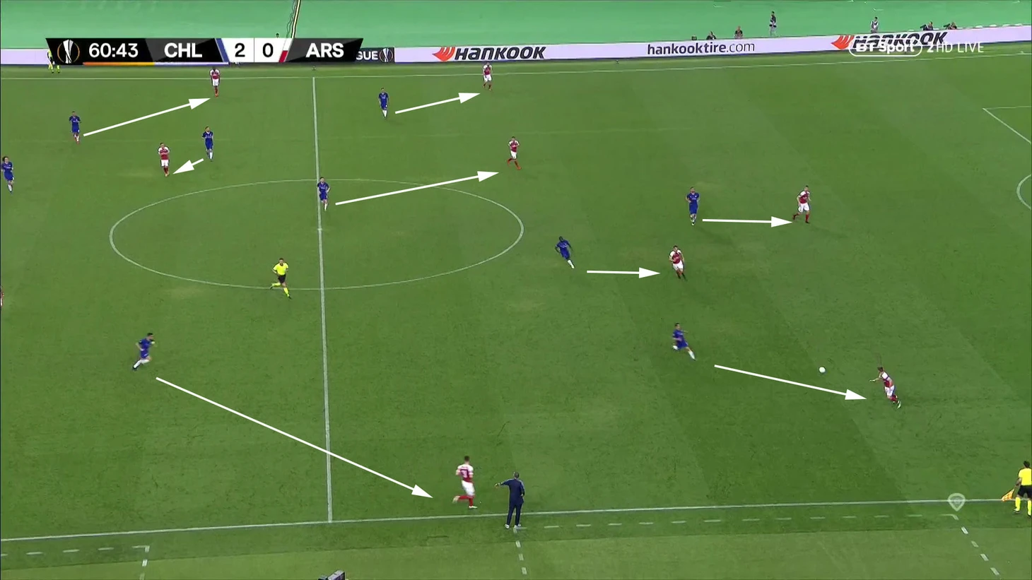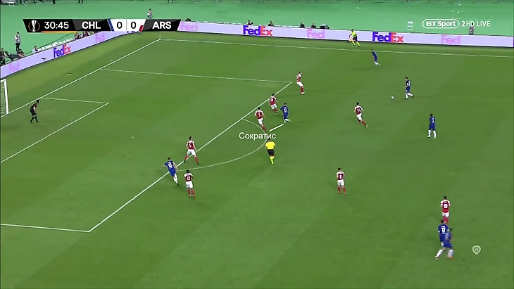 Разумеется, это открыло игру в обе стороны. Теперь у «Арсенала» было по 2 очень атакующих игрока на каждом фланге – каждый раз, когда Азар или Виллиан не дорабатывали в обороне, команда Эмери получала преимущество. «Челси» из-за рисков, на которые шел «Арсенал», получал идеальный сценарий для контратак.