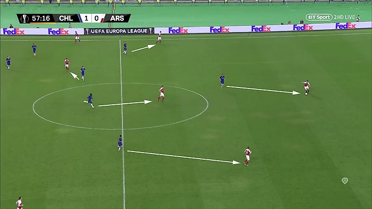 В отличие от Эмери, решив прессинговать, Сарри не сдерживал команду в конкретной зоне. Прессинг был слаженным и эффективным.