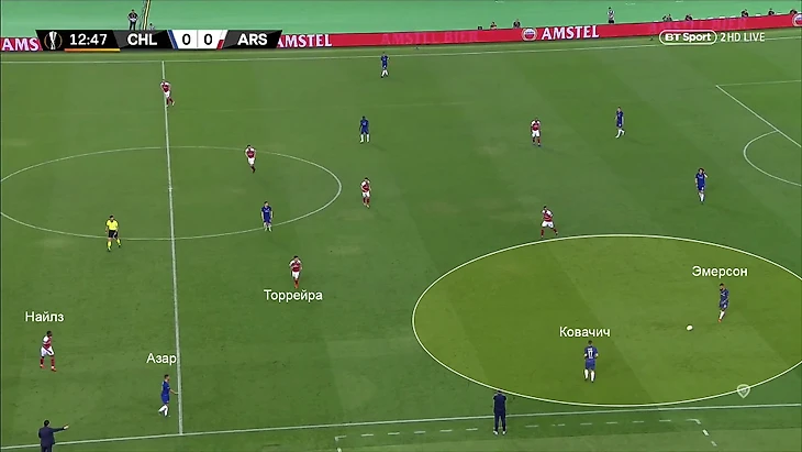 Найлз по традиции не выдвигается и играет с Азаром, Торрейра тоже держит позицию. И Эмерсон, и Ковачич свободны в первой стадии атаки: