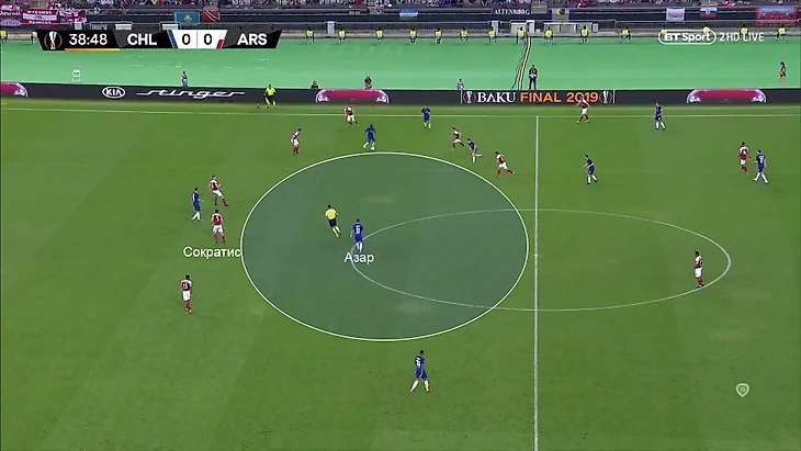 8. Основная угроза в таком сценарии исходила от Азара. К концу тайма «Челси» начал играть на половине поля соперника – «Арсенал» не справлялся с движением Эдена. Замысел был тем же: Сократис – ответственный за бельгийца, партнеры ему помогают. Только это крайне странная идея, учитывая, как свободно двигается Азар.