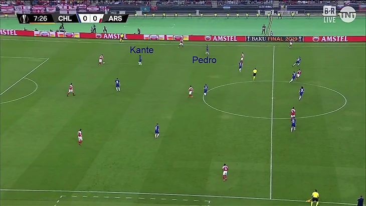 3. Работа в прессинге «Челси» сделана очень грамотно и практически на протяжении всего время (до 3 - 0) прессинговали коллективно высоко и слаженно вступали в контрпрессинг, особенно круто это делал Канте. Также в прессинге Канте и Педро менялись позициями, Канте уходил на правый фланг, Педро в некоторых эпизодах располагался чуть центральнее, в некоторых просто ниже.