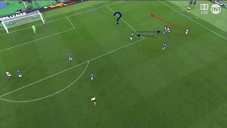 Эмерсон находился высоко из-за атаки «Челси», но партнеры потеряли мяч и «Арсенал» убегает в контратаку. Левый защитник прибегает к месту эпизода и страхует Давида Луиса, потому что бразилец занимал место Эмерсона. Вроде бы нормальная ситуация, но что происходит дальше? Мэйтленд-Найлз убегает за спину Луиса и готовится к прострелу. Уже понятно, что Давид Луис туда не успеет и туда должен был пойти Эмерсон, чтобы попытаться заблокировать удар. Но что он делает? Просто стоит. Много таких эпизодов не было, но этот вполне мог закончится голом «Арсенала».