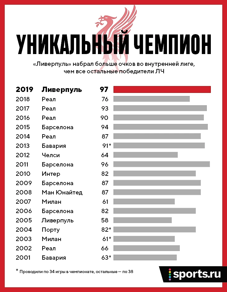 Одновременно чемпионат и ЛЧ выигрывал «МЮ» в 1999-м и 2008-м, оба раз «Юнайтед» не дотягивал до 90 очков. «Ливерпуль» стал вторым, но набрал 97 и этим опередил не только «МЮ», но и всех остальных победителей в истории ЛЧ – даже гениальную «Барсу» Гвардиолы.