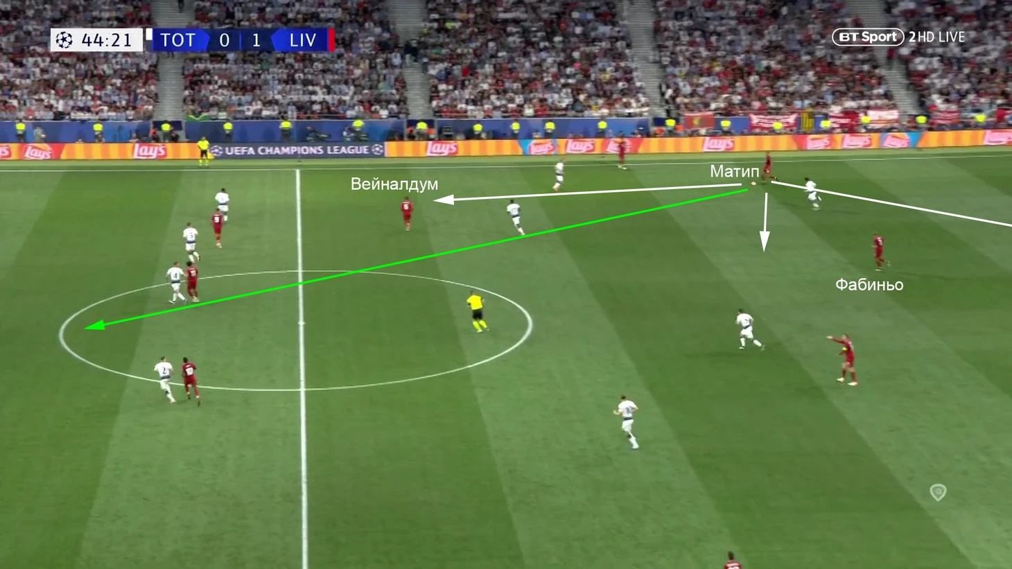 У Матипа есть вариант покатить мяч в опорную зону, где его получит сделавший пару шагов вперед Фабиньо, есть вариант отдать назад на Алиссона и заставить соперника еще побегать, есть вариант развить атаку через фланг, где открывается Вейналдум. Матип выбирает самый рискованный, трудный и прямолинейный вариант – прямой заброс в направлении Салаха и Мане: