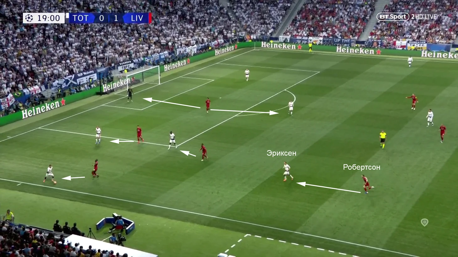 Но когда Эриксен смещается в центр, защитник не идет за ним. Это приведет к самому острому моменту «Тоттенхэма» в тайме: