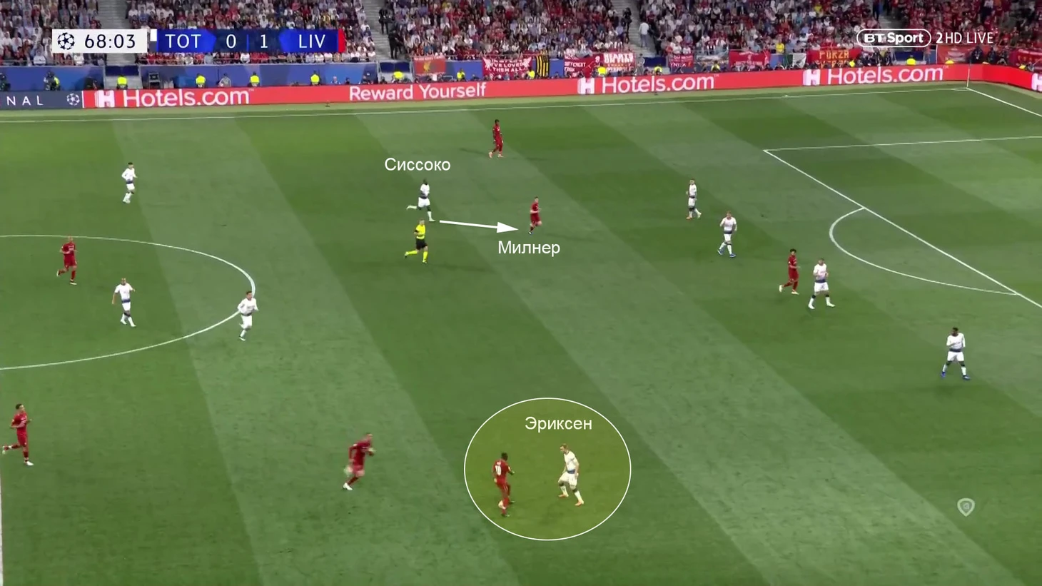 Минус: опорная зона стала еще более открытой. Суицидально открытой. Мане против Эриксена, Сиссоко – с Милнером. Садио легко обыграет Кристиана 1-в-1 – Эриксену просто не хватает цепкости в таких эпизодах. Сиссоко не доиграет Милнера до конца – «Ливерпуль» организует один из лучших моментов в тайме: