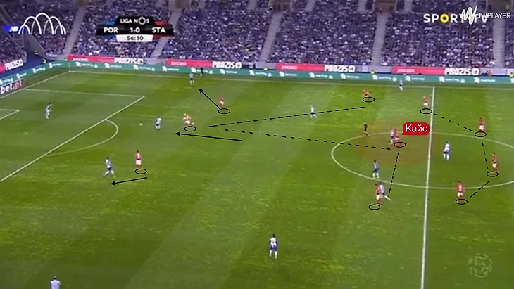 Санта Клара играла 4-4-2 в среднем блоке, при редких попытках высокого прессинга Кайо оставался в глубине для страховки проникающих передач через центр и лонг-боллов, без выпадов в переднюю линию: