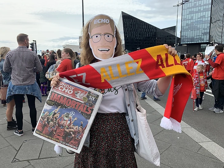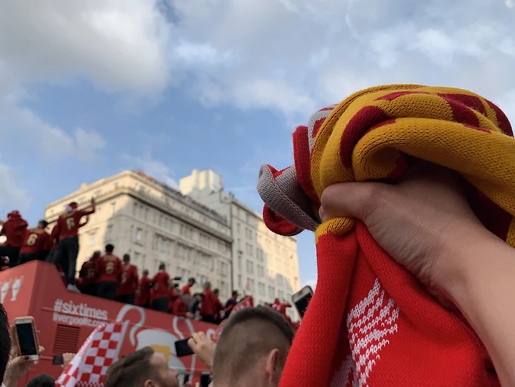 Наш спецкор Даша Конурбаева поехала в Ливерпуль на главный чемпионский парад сезона. В городе сейчас все гоняют в красных футболках и шарфах, поэтому Даша тоже купила шарфик. Он пережил с ней лучшие мгновения вчерашнего дня (собственно, финала) и сегодняшнего парада.