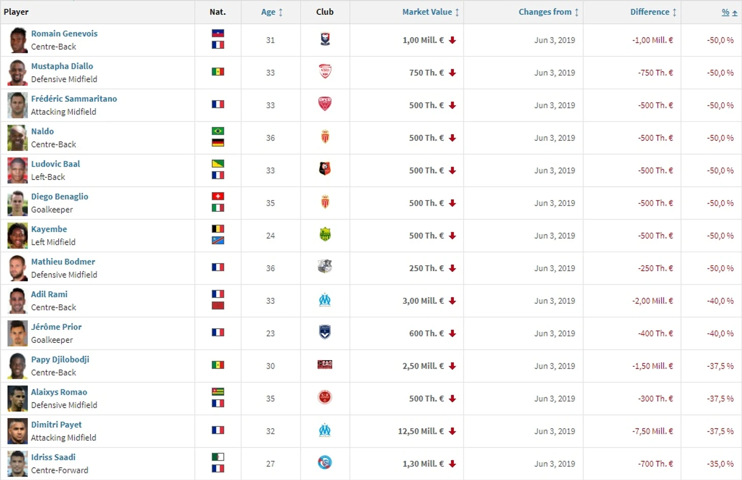 Старость не радость. Многие возрастные игроки Лиги 1, которые мало играли в этом сезоне, потеряли по 50% стоимости. Однако сильно подешевели и пара молодых, которые не выходят на поле. Самыми яркими в этом писке являются Димитри Пайет и Диего Бенальо.
