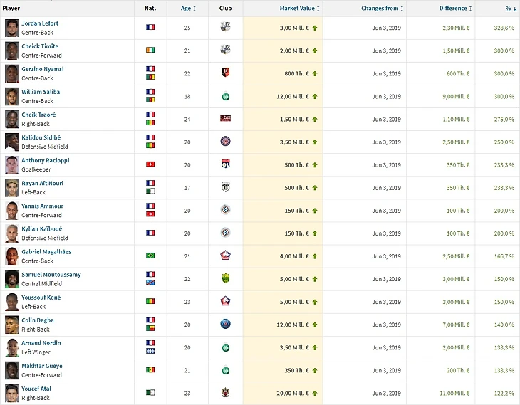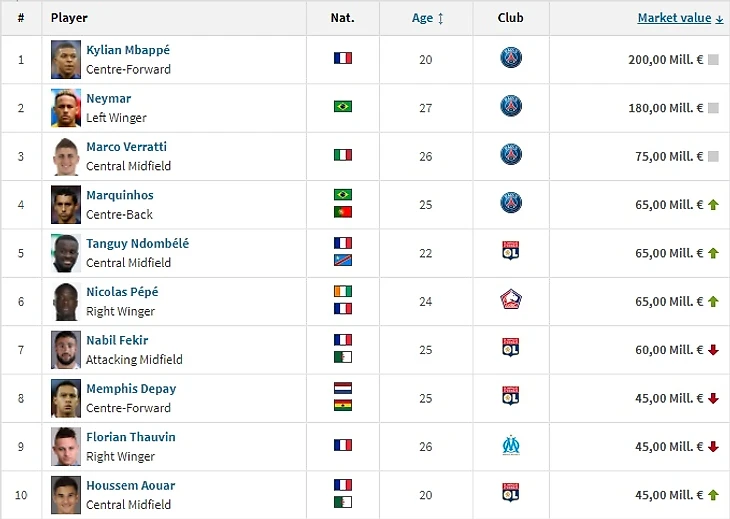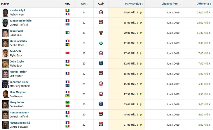 Transfermarkt обновил трансферные стоимости игроков. Набиль Фекир упал в цене, поэтому его одноклубник Танги Ндомбеле, прибавивший 15 миллионов, и Николя Пепе, подорожавший на 25 миллионов, ворвались в Топ-5 Лиги 1.