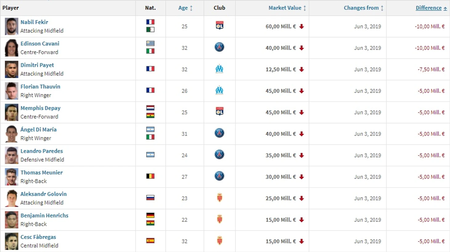 По итогам сезона-2018/19 в Лиге 1 сбавили в цене больше всех Набиль Фекир и Эдинсон Кавани - по 10 миллионов евро. Также в Флоп-10 вошёл и россиянин Александр Головин.