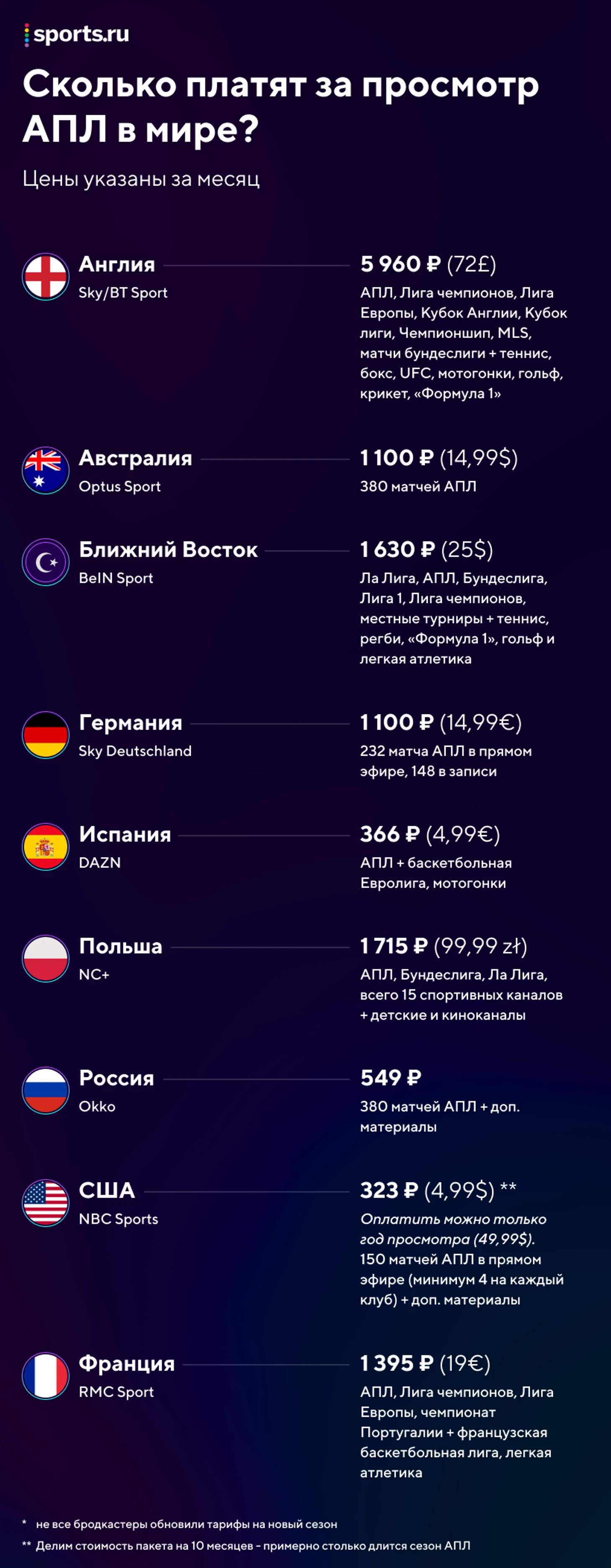 По этой инфографике получается, что у России действительно низкая цена за просмотр матчей АПЛ. Но есть важный момент: Okko из спорта показывает только английский футбол, а у правообладателей в других странах он входит в специальные пакеты (с другими чемпионатами и другими видами спорта) – и с учетом этого они выглядят не так уж и дорого на фоне России.
