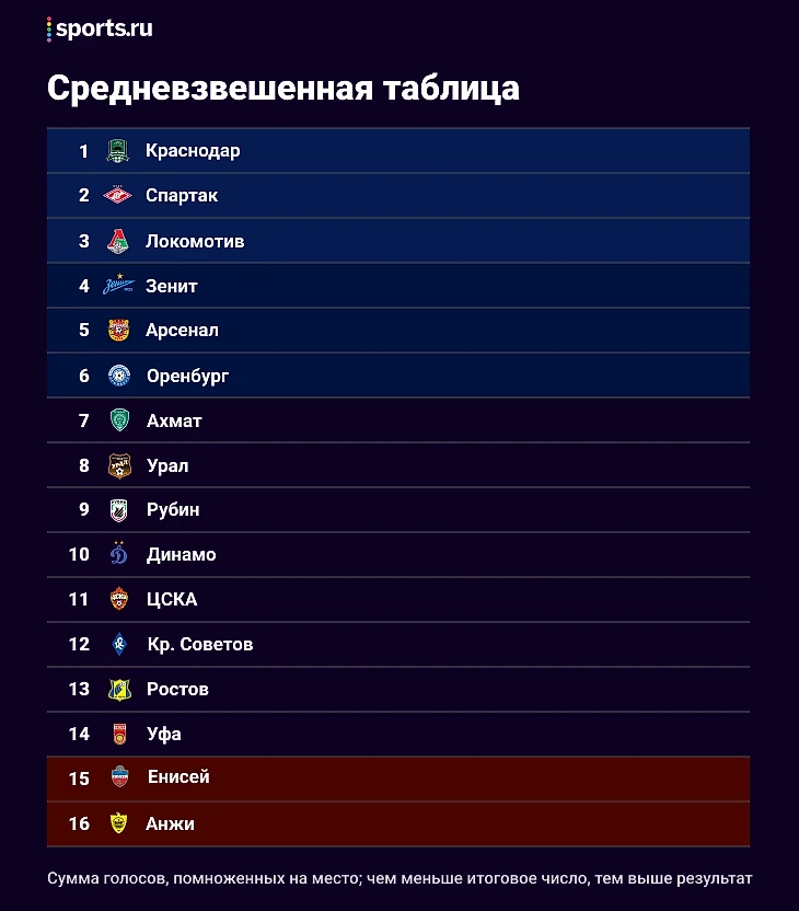 Чуть больше недели назад закончился чемпионат России — и мы попросили вас составить идеальную таблицу. Можно было, например, отправить «Спартак» в пердив, а чемпионом сделать «Оренбург» или «Енисей» – в общем, полная свобода. Теперь мы собрали данные (учитывались только результаты тех, кто поделился своей таблицей в соцсетях). И вот что получилось: