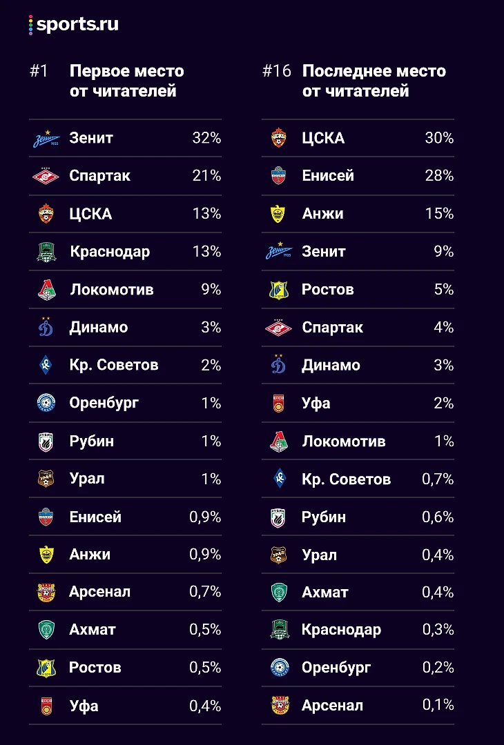 • Еще 21% поставил на первое место «Спартак», а 13% – ЦСКА. Меньше всех первых мест получила «Уфа» – всего 0,4%.