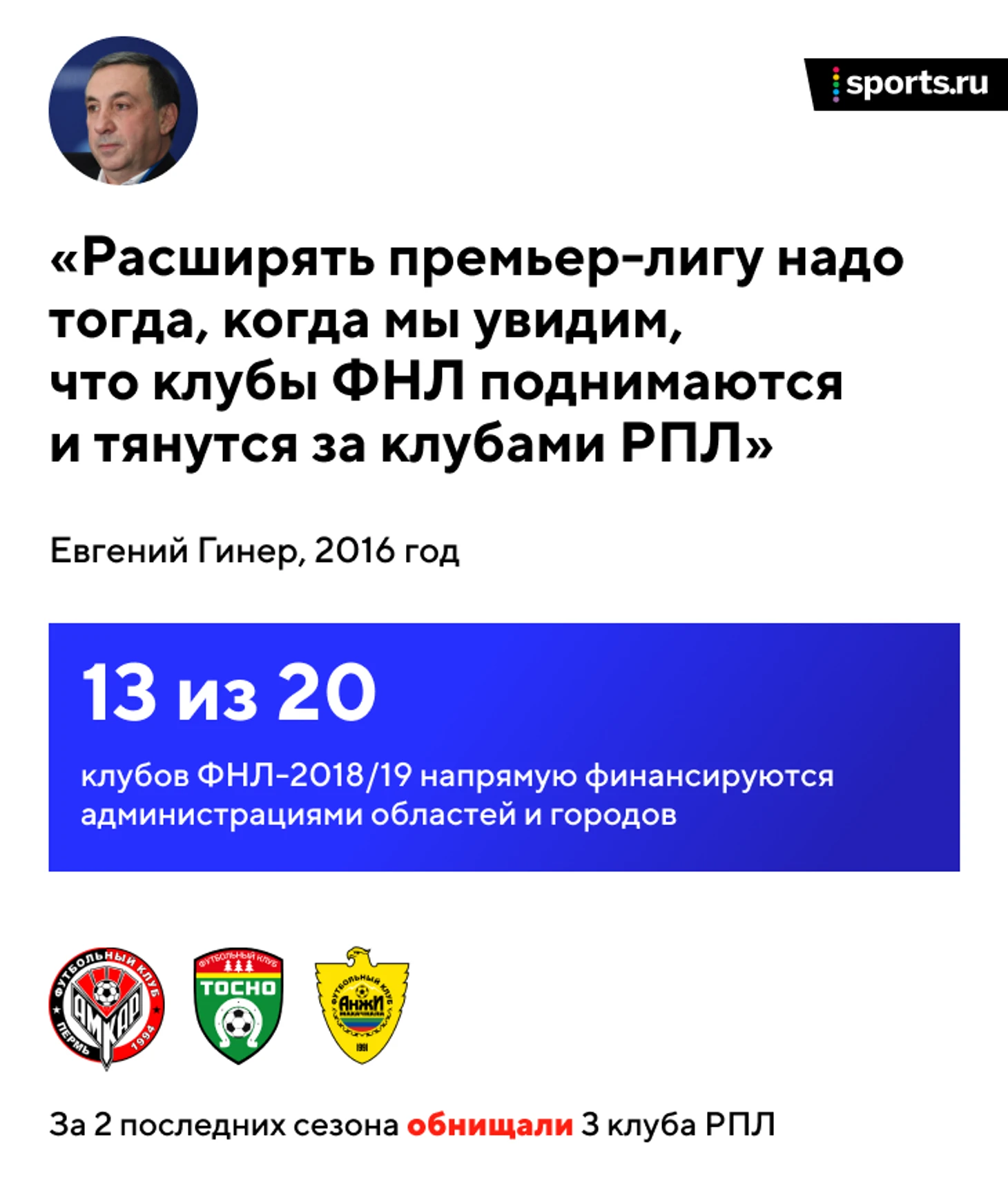 Спустя год Евгений Гинер вспомнил о проекте расширения чемпионата на майском исполкоме – и процесс полетел. Важно понимать, что Гинер – давний сторонник увеличения количества команд, он говорит, что 30 матчей нормальным командам недостаточно для тонуса. Но еще в 2016 году Гинер добавлял: «Чтобы улучшить результаты сборной и наших клубов в еврокубках, нужно расширить премьер-лигу – но делать это надо тогда, когда мы увидим, что клубы ФНЛ поднимаются и тянутся за клубами РПЛ».