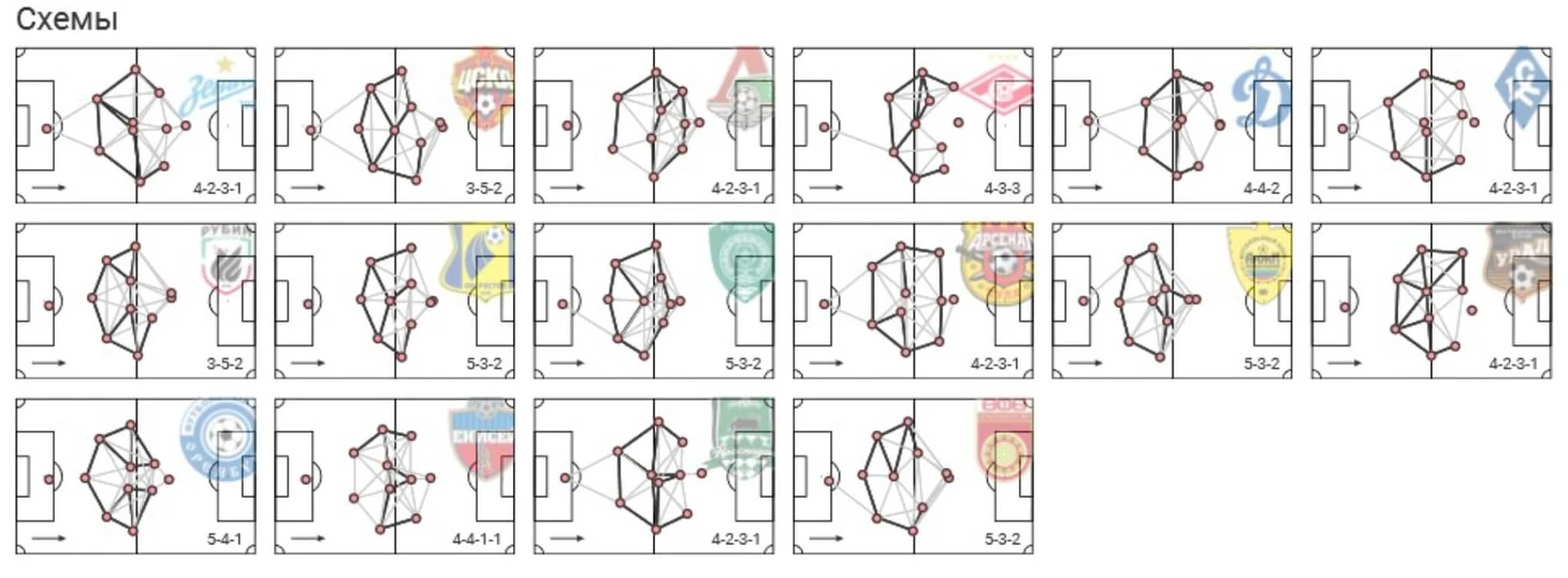 На скриншоте — средние схемы команд РПЛ этого сезона от сервиса WyScout, там учтены схемы, расположения игроков и связи