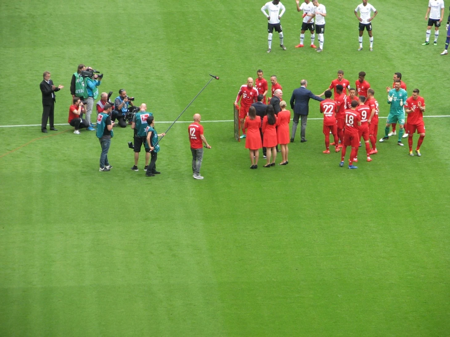 На поле появляются разминающиеся игроки мюнхенского клуба. Среди них — главные герои сегодняшней встречи. Диктор громогласно приветствует Арьена Роббена, Франка Рибери и Рафинью, а болельщики вторят ему. За приветствием следует обязательная церемония от руководства клуба. Красиво оформленные памятные фотографии, цветы и аплодисменты фанатов, сотрясающие стены сооружения.