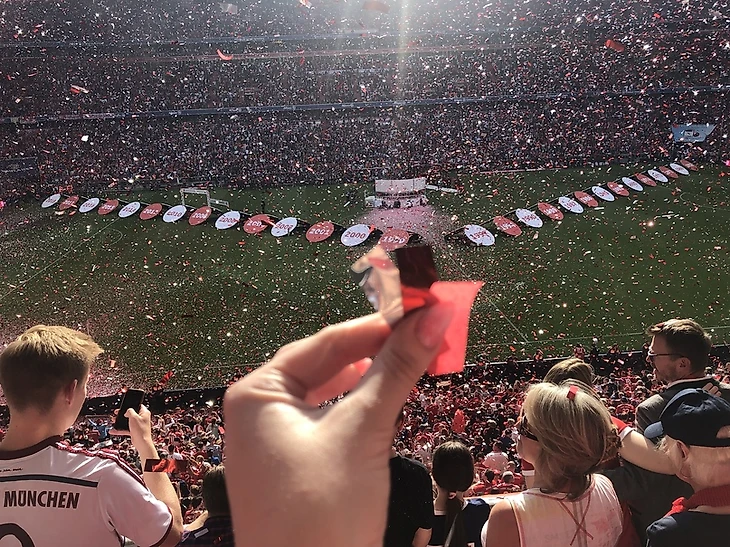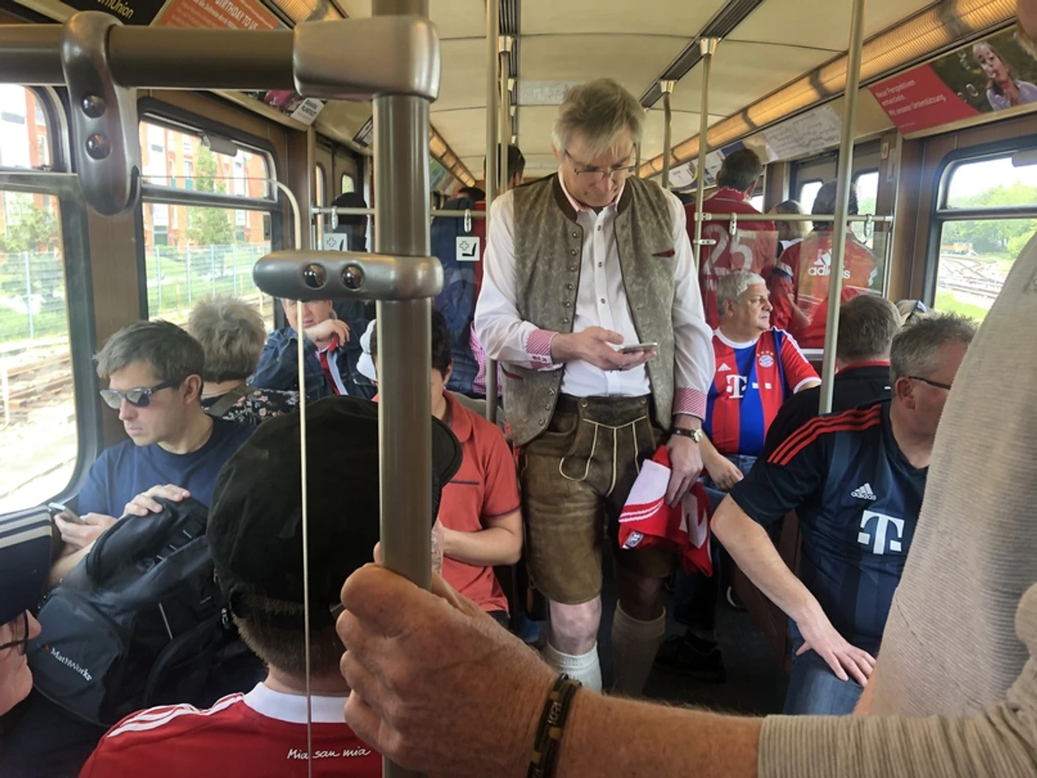 Уже в метро, как и положено, наблюдается множество людей в баварской форме разных лет и в разномастной атрибутике, вроде традиционных ледерхозе. Вообще в матчдэй город кишит болельщиками «Баварии». Да, есть среди них и приезжие, но футбольная культура настолько объединяет, что невозможно отличить иностранцев от коренных баварцев. Удивительно видеть всю эту толпу после российских реалий, где случайно замеченная кепка «Баварии» приковывает внимание. Здесь же человек без какой-либо экипировки становится сосредоточением пристальных взоров. Потому что за «красных» здесь болеют все. Без преувеличения. Однако, безумного ажиотажа здесь не наблюдается, даже несмотря на весьма важный матч. Хотя седьмое чемпионство подряд…