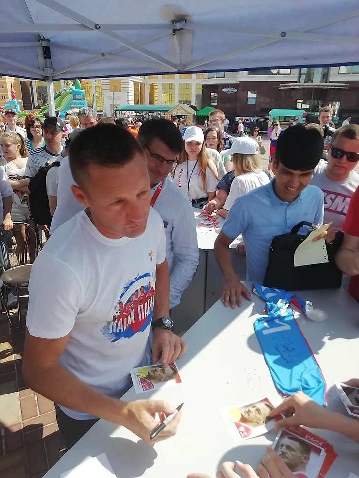 На площади Тысячелетия( тысячелетие с момента единения мордовского народа с народами Российского государства) звёзды сборной России прежних лет- Руслан Пименов, Дмитрий Хлестов, Андрей Тихонов вместе с простыми болельщиками поучаствовали в конкурсах, а после этого к всеобщему восторгу провели автограф-сессию. Особо удачливым, кроме автографов, удалось «разжиться» и фотографиями с футболистами.Очень не хочется говорить экс-футболисты. Потому, что каждый из троих (и даже заметно «раздобревший» Руслан Пименов ) даст фору многим молодым игрокам.