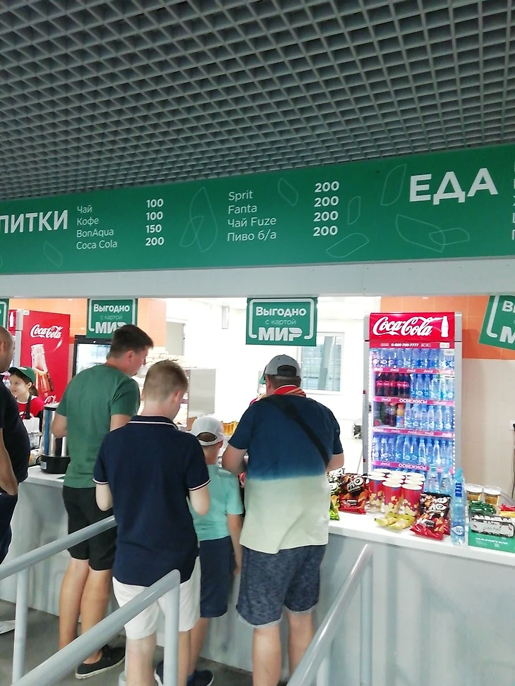 На самих трибунах становится очевидно, что многие на футболе впервые! Совсем маленькие детишки и, убелённые сединами мужчины, с одинаковым восторгом переводят взгляд с изумрудного поля на толпы снующих болельщиков. Для тех, кто на стадионе уже не первый час особенно актуальным становится вопрос питания. Хоть и фуд-кортов на стадионе предостаточно, но вот цены на еду и напитки немного шокировали. Однако это было главным разочарованием, и никоим образом не могло испортить праздник десяткам тысячам болельщиков .