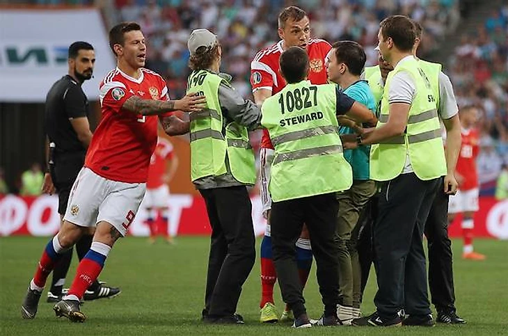 Капитан сборной, Артём Дзюба, как обычно старался успеть везде. Необременённый в этот раз оборонительными функциями, он всё равно успел проявить себя в защите. Правда в защите не подступов к воротам Гилерме, а защите прав и свобод молодого человека, который выбежав на поле так долго оставался неуловимым, что в итоге был снесён работниками стадиона приёмом из американского футбола