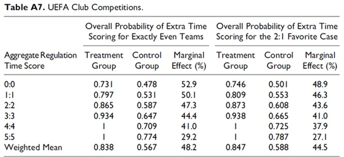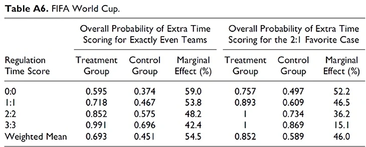В таблицах выше приведено изменение в вероятности забить в дополнительное время: в случае, если в первые пять минут овертайма был забит гол (Treatment group) или же если его не было (Control group), с контролем на итоговый счет после окончания основного времени. Эффект на эту вероятность (Marginal effect) высчитывался для Чемпионата Мира (таблица A6) и Лиги Чемпионов (таблица А7), также сравнивалось изменение вероятности для ситуации, где обе команды равные (левая колонка каждой таблицы) и ситуации, где был фаворит (правая колонка). Так, в матче Чемпионата Мира, где обе команды равны, а основное время завершилось нулевой ничьей, вероятность забить еще один гол после того, как мяч был забит в течение первых пяти минут овертайма, равна 73.1%, в то время как в матче, где быстрого гола не произошла, вероятность забить составила только 47.8%, что дает маржинальный эффект в 52.9% (то есть увеличение вероятности более чем в полтора раза).