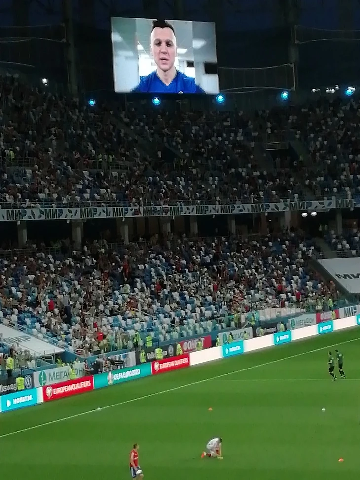 Стадион заметно оживился когда, на экране табло появилось видеообращение Дениса Черышева к болельщикам, с призывом поддержать команду! Денис родился в Нижнем Новгороде, и его здесь просто обожают! Даже несколько игроков сборной на пару мгновений отвлеклись от разминки, и с интересом смотрели на экран.
