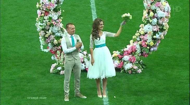 В перерыве матча прямо на газоне состоялось удивительное событие. Максим, молодой человек из Чебоксар, стал победителям конкурса, организованного РФС. И, кроме того, что ему и невесте Наталье посчастливилось зарегистрировать свои отношения перед 40- тысячной аудиторией, пара получила возможность отправиться в свадебное путешествие….на Кипр)). Лично знаю, нескольких Максимов из Чебоксар, так что безумству поступка особо не удивлён.