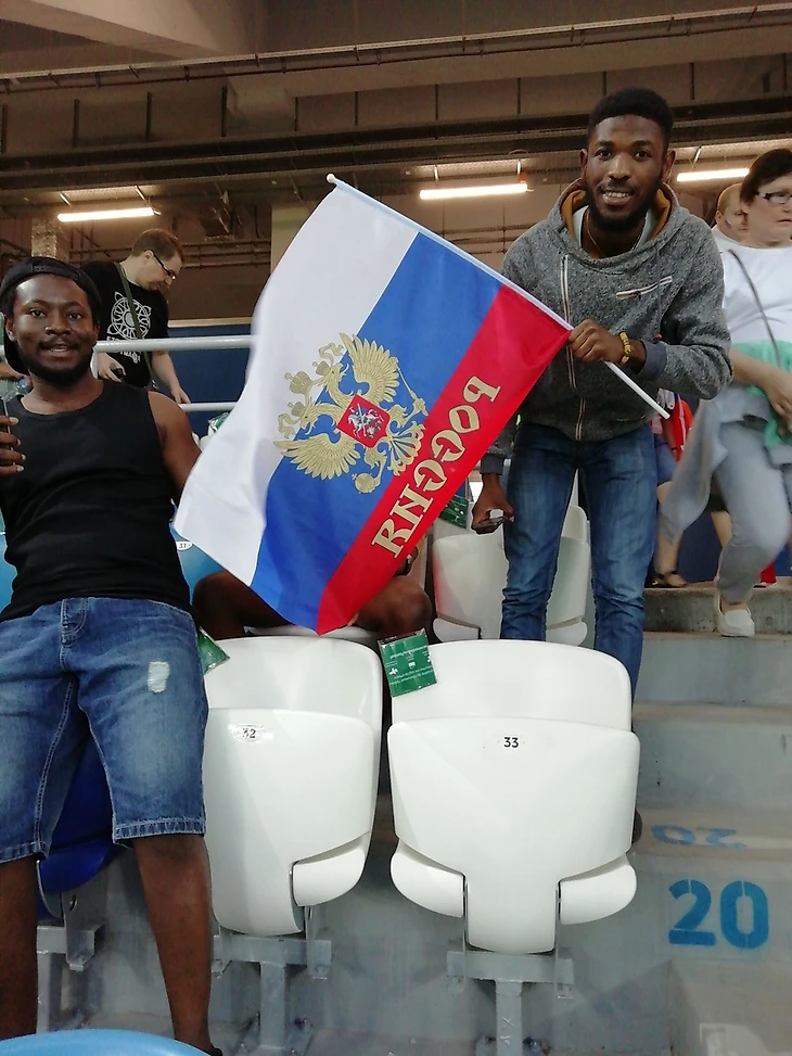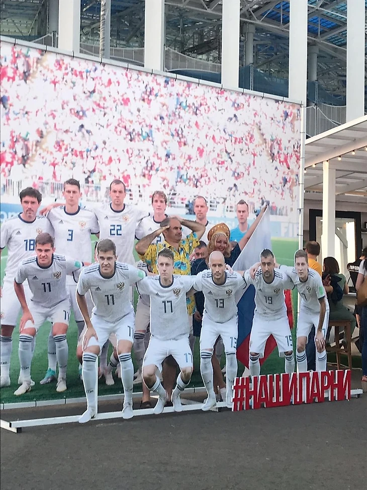 Чем ближе стадион, тем больше счастливых лиц. Как и тремя днями ранее в Саранске, главный девиз match day – «Наши парни в городе», и на подходе к стадиону мы замечаем как минимум 4 баннера, напоминающих об этом. И вот он стадион!!! Как пел Владимир Семёнович Высоцкий: «О вкусах не спорят, Есть тысяча мнений…» Но, мне всё же, милее стадион в Саранске)