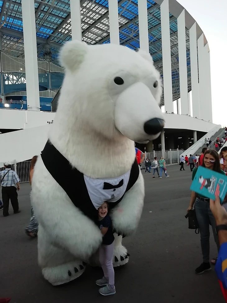Большая очередь из детишек выстроилась за «обнимашками» с огромным элегантным белым медведем. Как его занесло в среднюю полосу России, непонятно? Видимо, привезли специально для внушения умеренного чувства страха киприотам!
