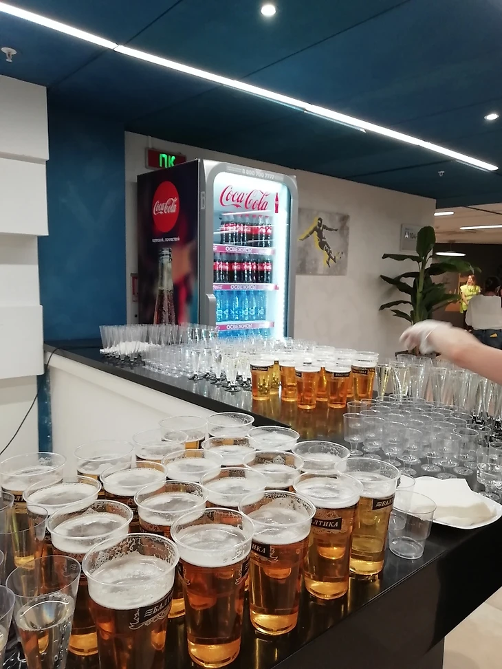 За час до матча, когда наша сборная вышла на разминку, трибуны были заполнены лишь на треть. Я встречаю знакомого из Москвы. У него на шее аккредитация, позволяющая попасть на VIP-сектор. «Хочешь посмотреть?»- «Спрашиваешь, ещё!» Даа-а-а, скажу вам, с этих мест смотреть футбол намного комфортнее. А учитывая, что обладателям билетов на эти сектора полагается бесплатный шведский стол, то древняя мудрость «Народ требует хлеба и зрелищ» становится ещё понятнее.