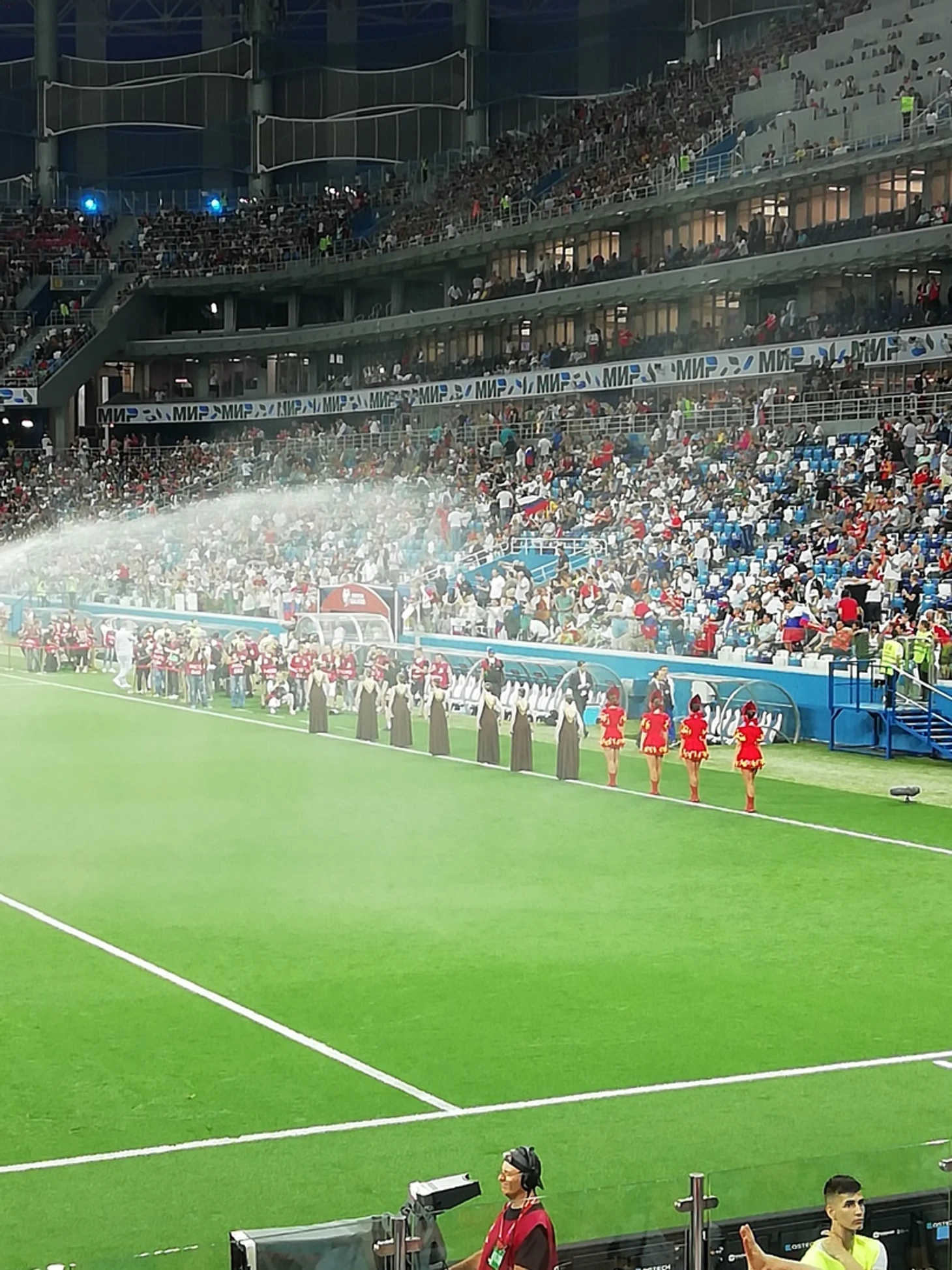 Тем временем всё уже готово к началу матча. Девушки в национальных костюмах, выстроившиеся у бровки , попадают под струи воды, вдруг включившейся, системы полива. Это было как минимум неожиданно, а скорее всего и холодно! Но, никто из девушек даже не пошевелился! Вот это выдержка!