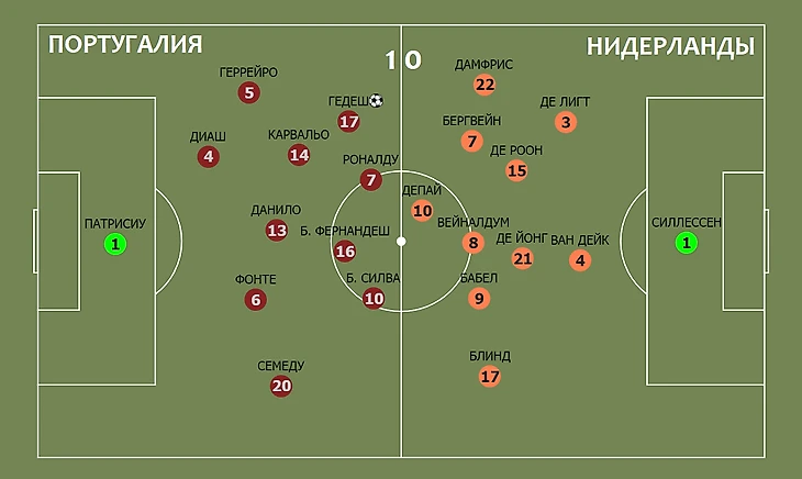 В результате, при преимуществе во владении (479 - 619 соотношение передач) футболисты из Нидерландов имели столько же проникновений на атакующую треть, сколько и португальцы (39 - 38), но создали гораздо меньше острых ситуаций (соотношение точных острых передач 12 - 6 в пользу Португалии) и нанесли всего три удара с игры (против 13 у соперника).