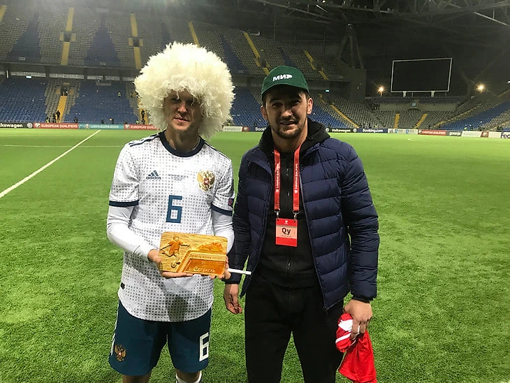 • Сначала на матч в Казахстан поехал болельщик Гаджимурад Исаев, который встречал меня в дагестанском селе Согратль и знакомил с гостеприимством Кавказа. В Астане он видел победу сборной 3:0, пообщался с Денисом Черышевым: подарил ему папаху и деревянную табличку ручной работы, а домой улетал не только с фото и формой сборной, но и автографом Дениса на картине с видом его родного Гунибского района. Теперь она хранится в культурном центре Согратля, а Гаджимурад избирается на главу родного села.