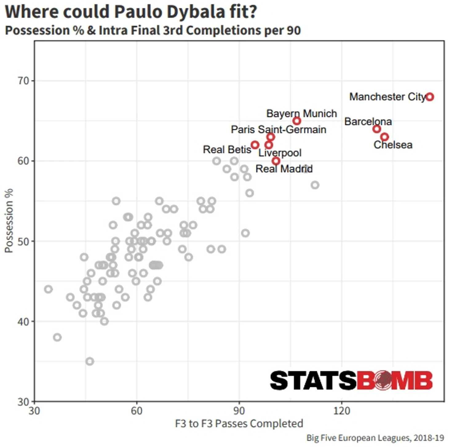 В 25 или 26 лет, Дибала ищет возможность освежиться и перезагрузить. "Я думаю, что есть две вещи, которые как бы изменили спортивную жизнь Пауло", - сказал Франсиско Бутелер, который тренировал Дибалу в молодежной системе в Instituto de Cordóba в Аргентине - и был, фактически, тренером, который сначала наигрывал его в качестве нападающего, чем в качестве атакующего полузащитника. "Одним из них был Чемпионат мира, где он сыграл очень мало минут, он потерял некоторую уверенность; другим было прибытие Криштиану Роналду, которое лишило его некоторой значимости и привело к тому, что он потерял уверенность в себе. С того момента, как он дебютировал в первой команде здесь, в "Институте", он был главным героем во всех своих командах, а теперь он таким не является. Пауло нужна команда, где вокруг него есть еще пара техничных игроков, которые хорошо обращаются с мячом. Любая команда, кто хочет иметь больше времени во владении", - Бутелер. Пауло преуспеет в такой команде. Если бы мне пришлось назвать эти команды, то это "Манчестер Сити", "Барселона", "Ливерпуль". Вот некоторые варианты, в которые он мог бы вписаться идеально. Все эти команды в среднем за сезон владели >60% времени.