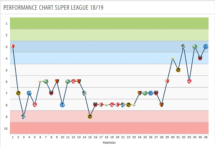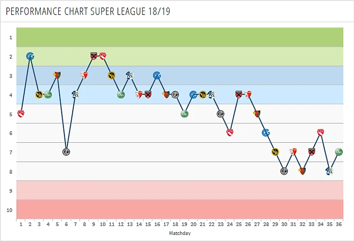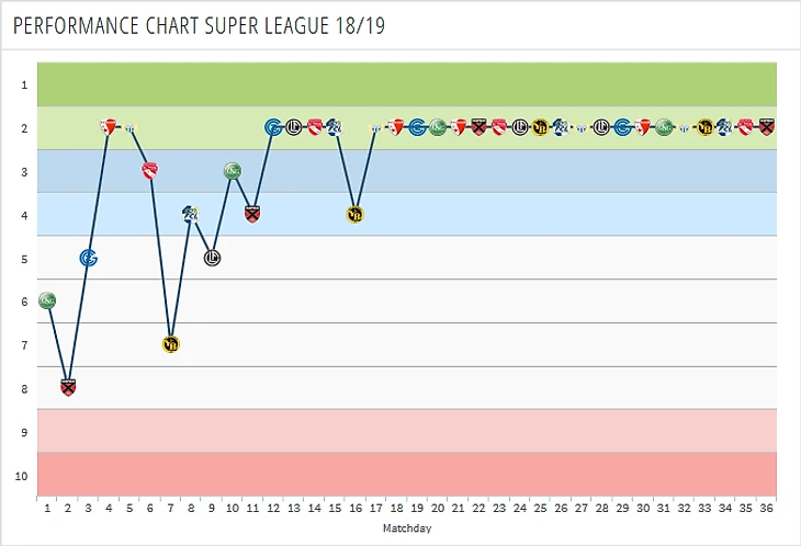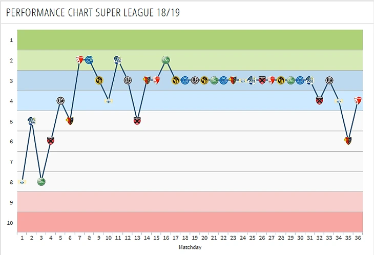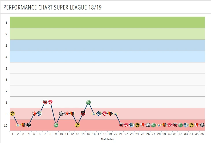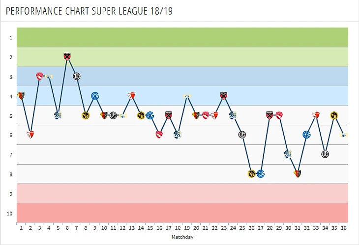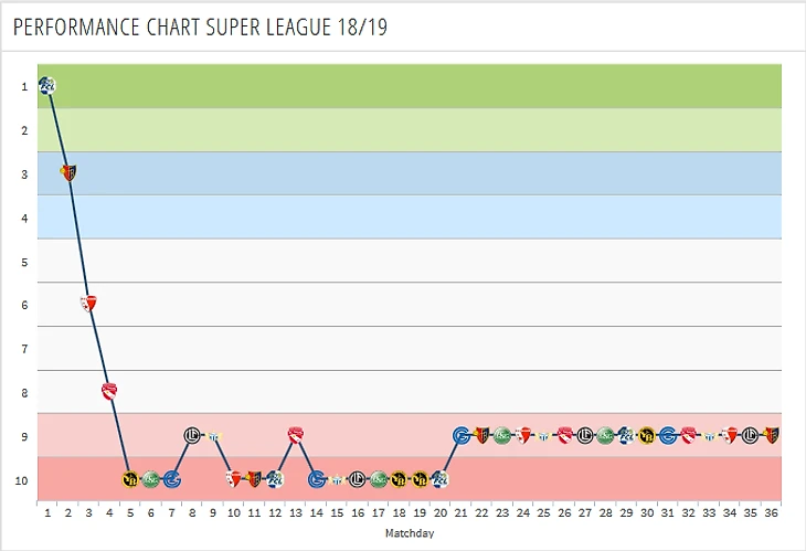 Для «Грассхоппера» сезон оказался катастрофичным. Проиграв чемпиону в неоднозначном матче первого тура, рекордмайштер сразу же оказался на стыковом месте и поднимался выше лишь на три тура за сезон, а в итоге закончил последним. Лучшим днём сезона для «кузнечиков» стало 25 ноября 2018 года: на городском референдуме было одобрено строительство нового стадиона и «Грассхоппер» выиграл у «Санкт-Галлена». 15 тур. Это была последняя победа «кузнечиков» в сезоне – после безвыигрышная серия из 21 матча (это, разумеется, абсолютный рекорд лиги), смена руководства, двух тренеров, скандалы с болельщиками и беспросветный хаос.