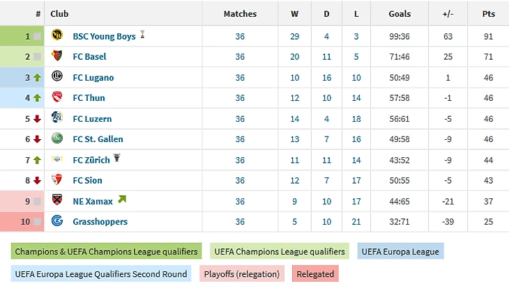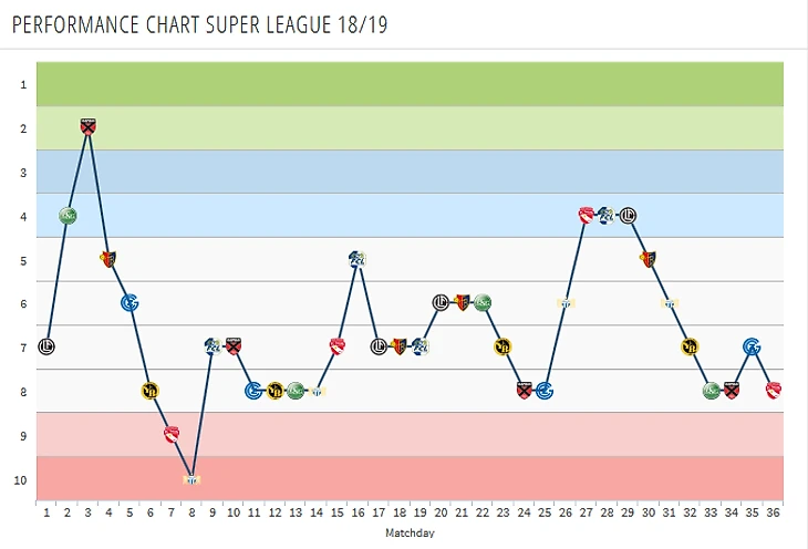 Оставив в любом случае слабореалистичные при живых «Янг Бойз» амбиции на титул, «Цюрих» в третьей четверти чемпионата крепко держался в зоне ЛЕ, в которой в этом году достаточно удачно поиграл, пока не встретил в лице «Наполи» соперника себе не по зубам. FCZ ни в Суперлиге, ни в тех же еврокубках нельзя было обвинить в безвольности, в нежелании играть, это была действительно слаженная команда с устойчивым желанием сражаться на поле. Тем не менее, «Цюрих» и стабильность – вещи несовместимые, и к последнему кругу команду настиг сильнейший спад физической формы, усиленный травмами ключевых игроков. Команда практически перестала забивать и на фоне уставшей к концу сезона обороны стремительно скатилась с четвёртого места на восьмое и чуть не угодила в стыки – шоковая мотивация сработала, и игру с «Ксамаксом» цюрихцы всё вытащили. Тем не менее, итоговое седьмое место для команды Маньена – который, надо полагать, продолжит работу с «Цюрихом» и в следующем сезоне, – нельзя назвать успехом. От Маньена, как от тренера безусловно очень талантливого, но недостаточно опытного, хотелось бы увидеть работу над ошибками: к такому спаду он оказался совершенно не готов. Отсутствие еврокубков должно упростить задачу.