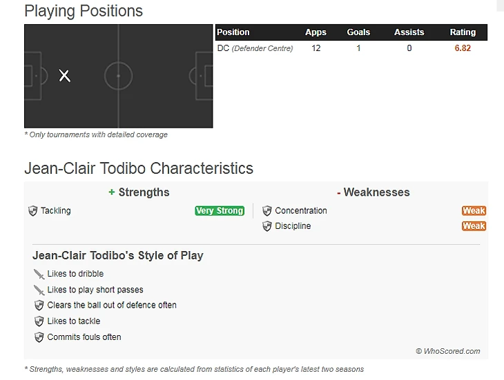 Тодибо — центральный защитник, который особенно хорош в отборах, поскольку завершил семь в том же матче против «Уэски». За 158 минут, проведенных на поле в Ла Лиге, француз отдал 92,4% точных передач, но получил две желтые карточки за два матча. Он также совершает фолы очень часто: четыре в двух матчах лиги.