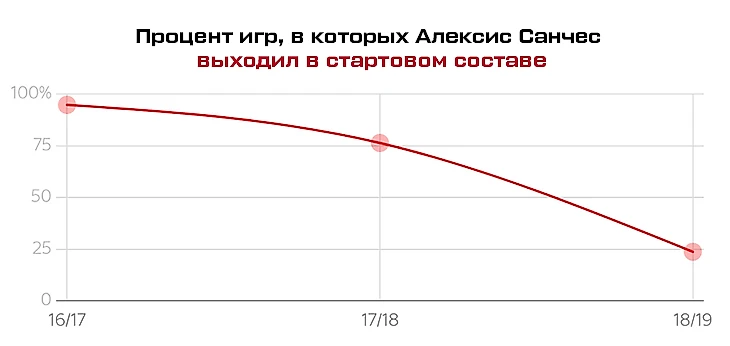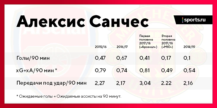 По некоторым показателям цифры упали в несколько раз. Такое часто случается, когда игрок переезжает в новый чемпионат или переходит из команды нижней части таблицы наверх. Но такое редко случается, когда игрок меняет один топ-клуб на другой: «Арсенал» и «МЮ» входят в топ-6 и борются за одно и то же место в Лиге чемпионов. Да, «Юнайтед» при Моуринью, куда переходил Санчес, значительно меньше владел мячом, но это не должно было привести к такому падению уровня игры. Особенно учитывая длинную историю классной адаптации Санчеса в предыдущих клубах. «Удинезе», «Барселона», «Арсенал» и сборная Чили заставляли его играть на разных позициях: левого, правого и центрального нападающего, даже на месте десятки. Тогда в чем вообще дело?
