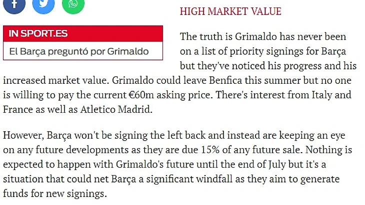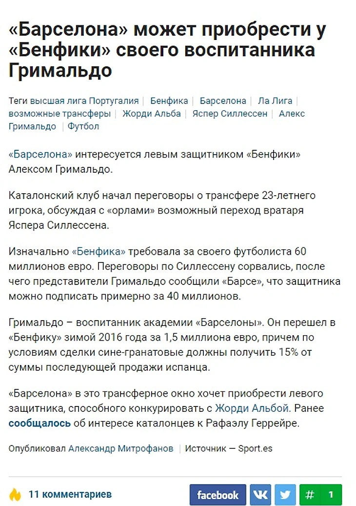 Усилиями Sports.ru второе известие о выяснении планов на Гримальдо для обогащения с пункта о проценте с перепродажи благодаря отвратному (мягко говоря) переводу превратилось в ««Барселона» может приобрести Гримальдо»! Вот так просто взяли и перевернули бытие, еще и создав такое ощущение, что Алекс готов вернуться в клуб к Бартомеу, который не имел ничего против маринования огромного таланта во второй команде!