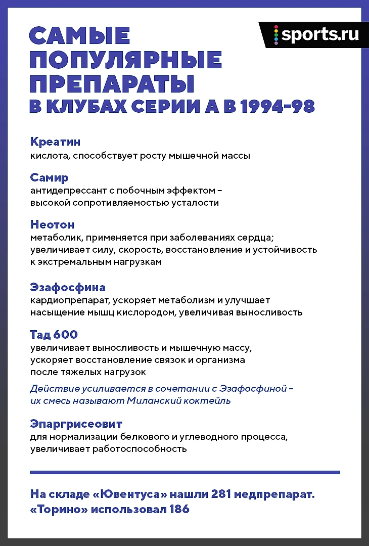 Неправильно говорить и о неспортивном преимуществе «Ювентуса». Фармакология никак не повлияла на количество трофеев в серии А: теми же препаратами пользовались абсолютно все итальянские клубы. Их не трогали только потому, что Раффаэле Гуариньелло был следователем из Турина – остальные команды не подпадали под территориальную юрисдикцию, поэтому судили только «Торино» и «Юве». Туринские игроки бегали под теми же веществами, что и в других клубах, и никого не превосходили в физике.