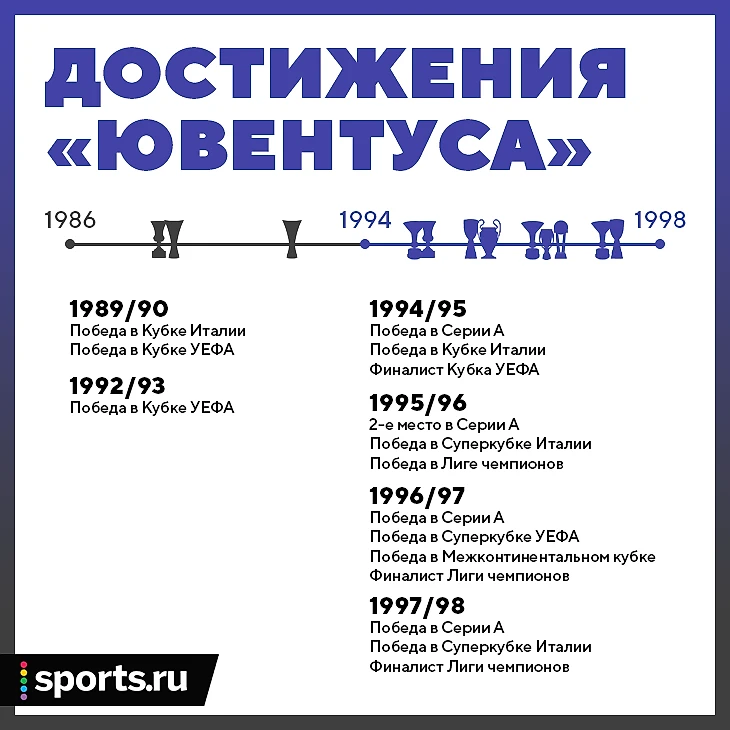 «Ювентус» был на пике застойного периода, длившегося восемь лет и разбавленного всего тремя трофеями. Последний скудетто туринцы выиграли в 86-м с Платини, а после этого не помогли ни Баджо с Лаудрупом, ни призванные из потустороннего советского мира Алейников и Заваров.