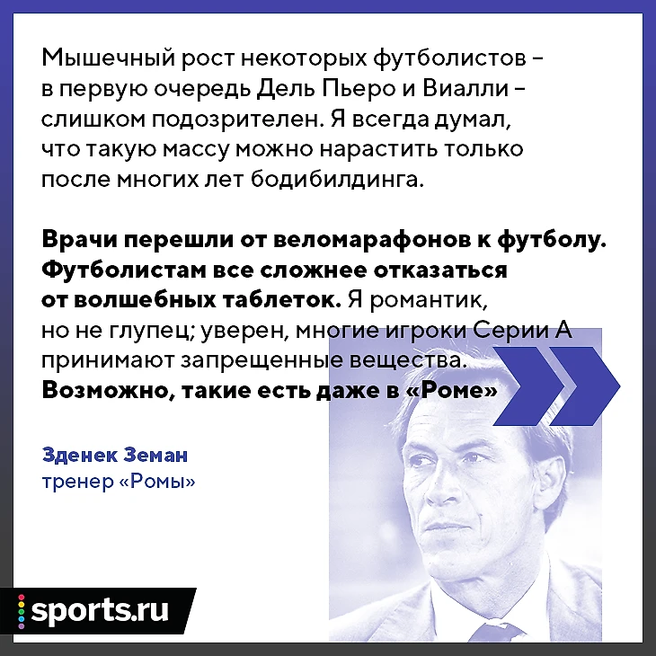 Врачи перешли от веломарафонов к футболу, но серия А не должна превратиться в Тур де Франс. Проблема в том, что игроки не видят дальше сегодняшнего дня, а клубы думают только о максимальном использовании ресурсов. Футболистам все сложнее отказаться от волшебных таблеток. Я романтик, но не глупец; уверен, многие игроки серии А принимают запрещенные вещества. Возможно, такие есть даже в «Роме».